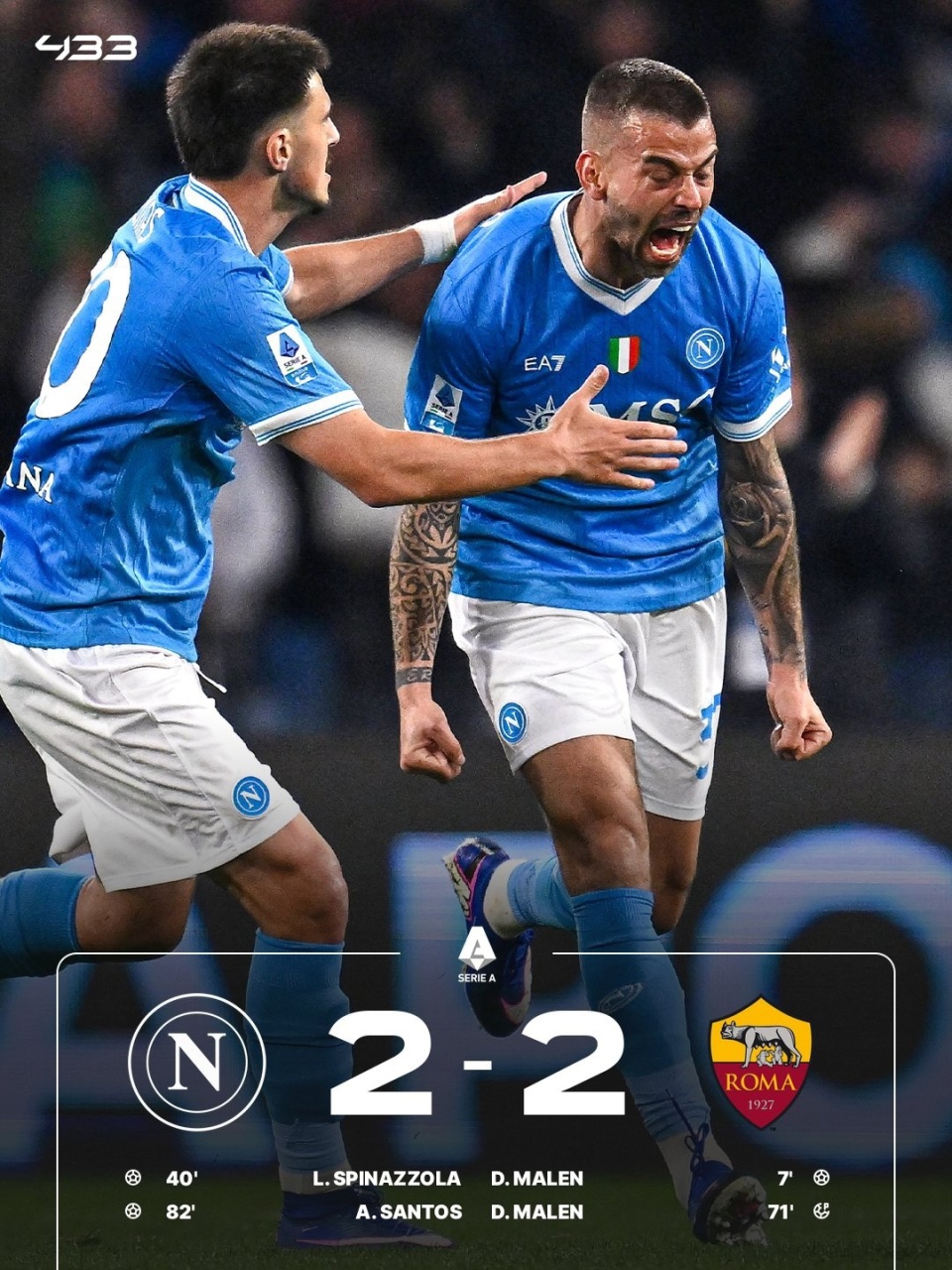 意甲第25轮,那不勒斯主场2-2罗马,50分第三,罗马47分第四。马伦先拔头筹,斯皮纳佐拉世界波,韦斯利造点+伤退,马伦点射破门连场双响,阿利森-桑托斯替补建功。