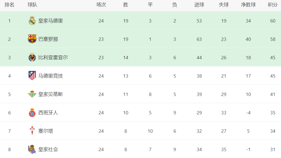 在积分榜上,皇马以60分排名榜首。皇马的战绩是19胜3平2负。巴萨则以58分屈居第2名。不过,巴萨比皇马少踢1轮,接下来有机会重登榜首。比利亚雷亚尔45分排名第3。马竞惨败之后,依然是45分,但净胜球比比利亚雷亚尔少,跌到了第4名。皇家贝蒂斯赢球后,总积分是41分,继续缩小与身前球队的差距,排名第5,距离欧冠区越来越近。西班牙人拿到35分,排名第6。