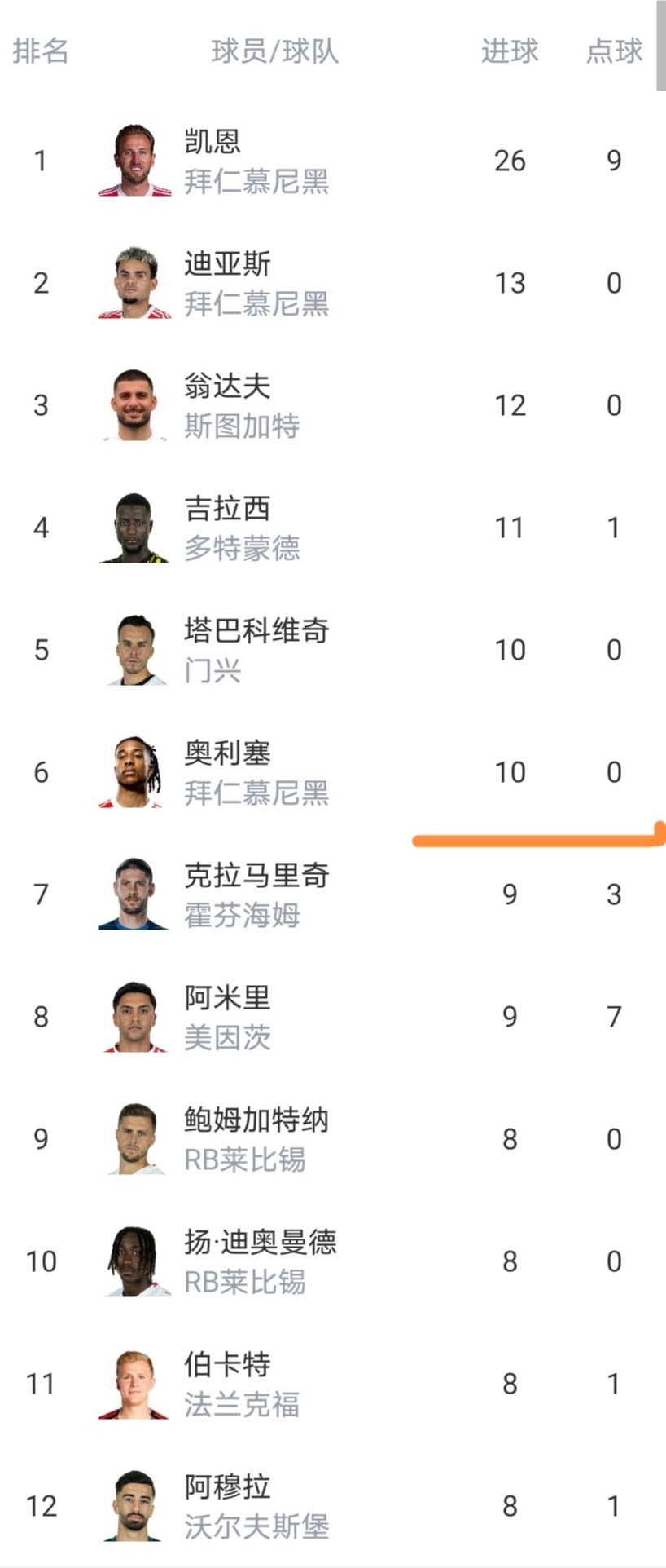 射手榜已经有6人进球上双,凯恩以13球优势领跑,领先优势巨大。