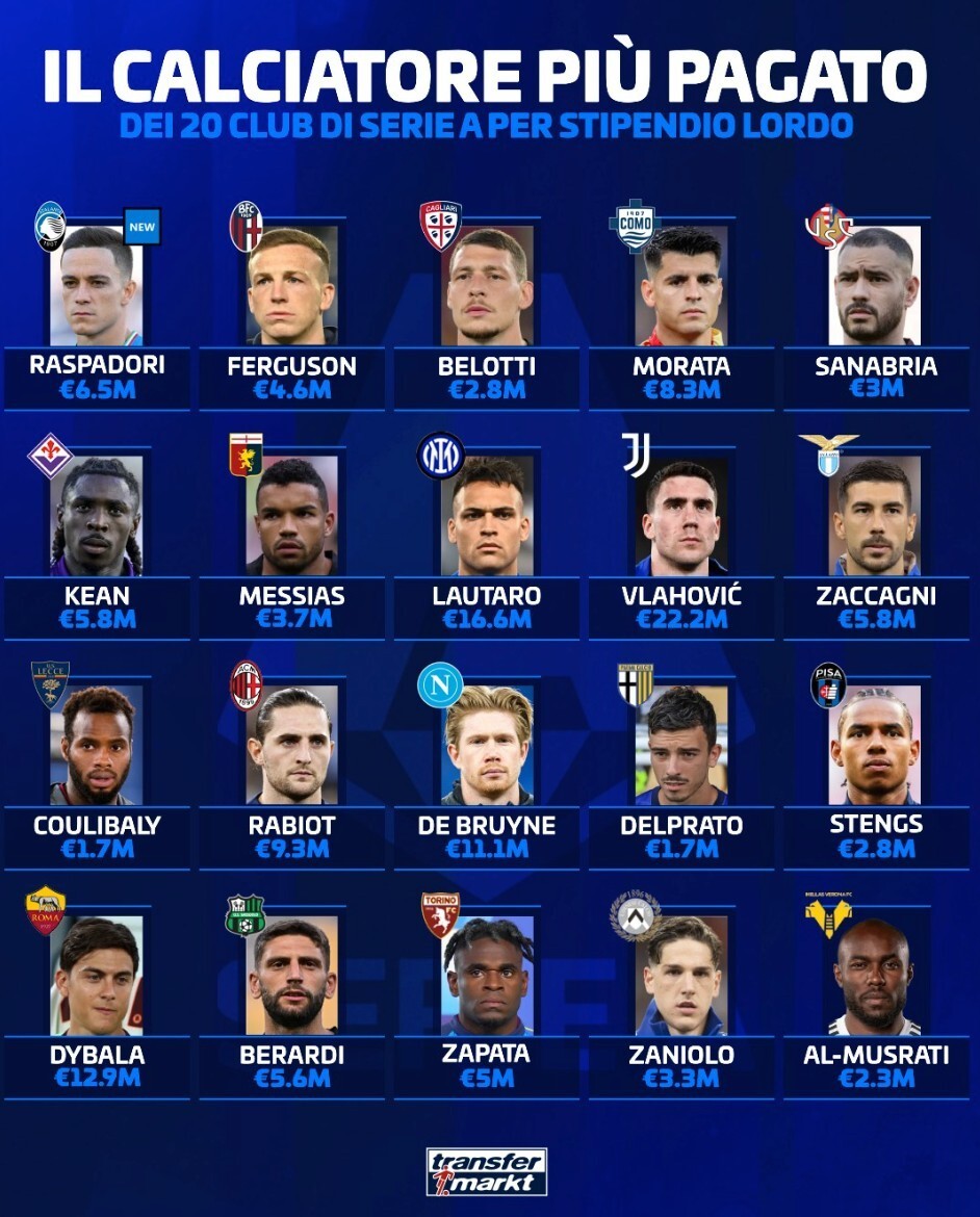 北京时间2月17日,德转统计出了本赛季意甲20家俱乐部各自队内的顶薪球员,其中尤文图斯前锋弗拉霍维奇以税前2220万欧元的年薪位居意甲第一,劳塔罗1660万欧元第二,迪巴拉1290万欧元第三。