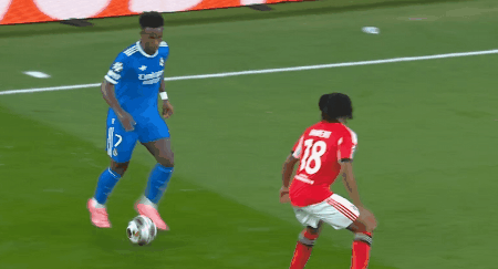 第72分钟,居莱尔快速分球,维尼修斯趟过巴莱罗,顺势小角度弹射,特鲁宾做出精彩扑救。