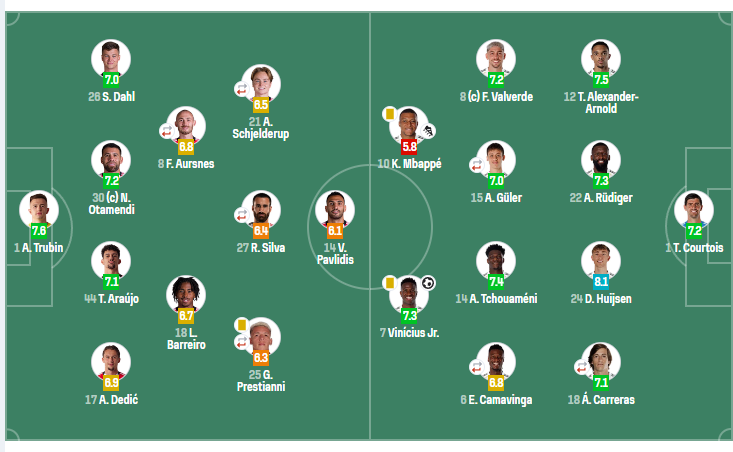 中场:8-巴尔韦德(87’21-卜拉欣·迪亚斯)、6-卡马文加(94’45-蒂亚戈·皮塔奇)、14-楚阿梅尼、15-居莱尔