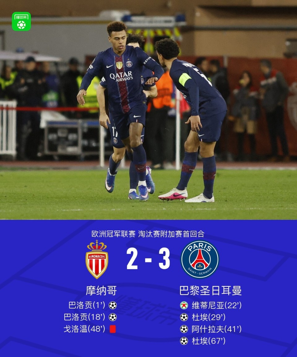 北京时间2月18日欧洲冠军联赛 淘汰赛附加赛首回合,摩纳哥对阵巴黎圣日耳曼。摩纳哥巴洛贡梅开二度。巴黎圣日耳曼杜埃梅开二度,阿什拉夫破门。最终比分摩纳哥 2-3 巴黎圣日耳曼。