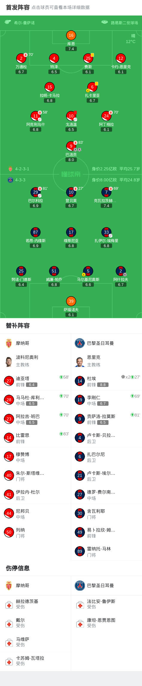 第18分钟,巴黎防线再次被打穿,巴洛贡禁区低射破门,摩纳哥2-0巴黎