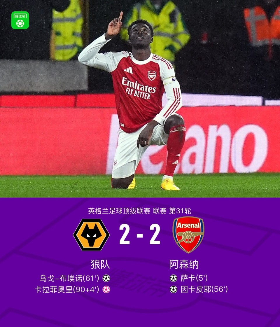 北京时间2月19日英格兰足球顶级联赛第31轮,狼队主场对阵阿森纳。狼队乌戈-布埃诺破门。阿森纳萨卡破门,因卡皮耶破门,卡拉菲奥里自摆乌龙。最终比分狼队 2-2 阿森纳。