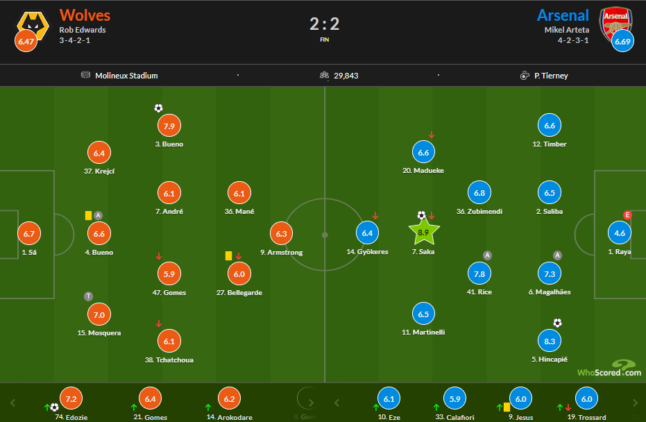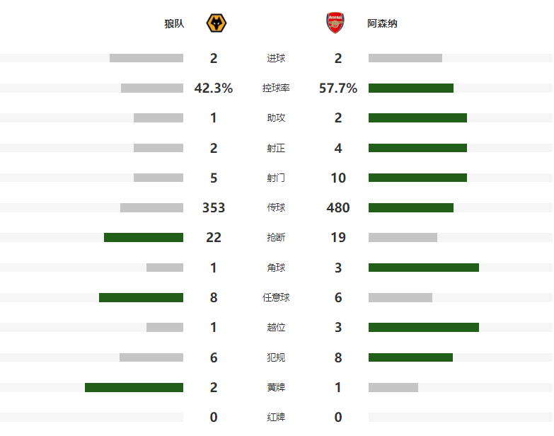 本场比赛萨卡和因卡皮耶的进球,让阿森纳一度取得了两球的领先,不过没有顶住狼队的疯狂反扑,后者靠着布埃诺和埃多齐的进球,2-2逼平了领头羊阿森纳。