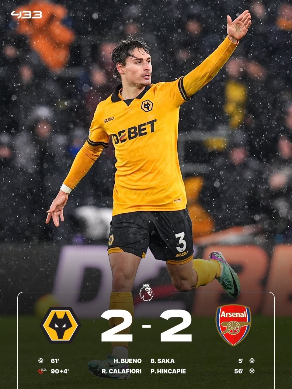 英超第31轮,阿森纳客场2-2狼队,先赛一场情况下5分优势领跑。萨卡破门打破15场进球荒,赖斯助攻,因卡皮耶打入个人处子球,圣地亚哥-布埃诺扳回一球,萨卡伤退,埃多齐补时绝平。