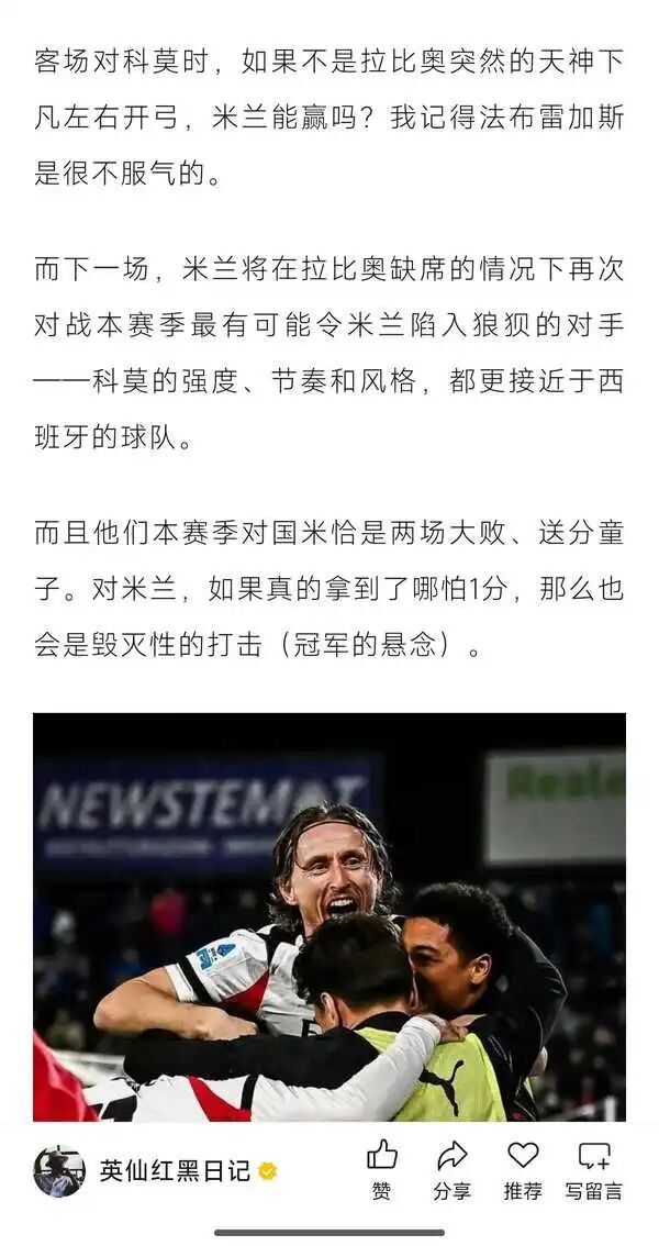 1-1科莫,联赛第9平,可能意味着米兰已经和意甲冠军没有关系了。这一刻,很多糟糕的想法涌上心头。