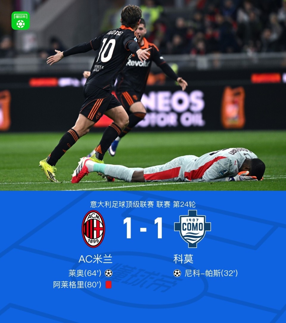 北京时间2月19日意大利足球顶级联赛 第24轮,AC米兰主场对阵科莫。AC米兰莱奥破门。科莫尼科-帕斯破门。最终比分AC米兰 1-1 科莫。