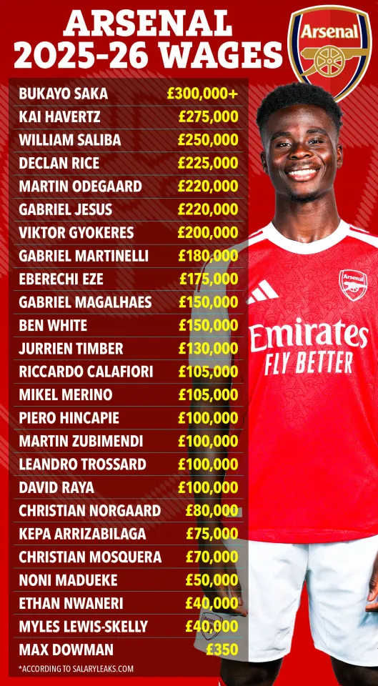 2025-26赛季的队内薪资结构显示,萨卡排在第一档。