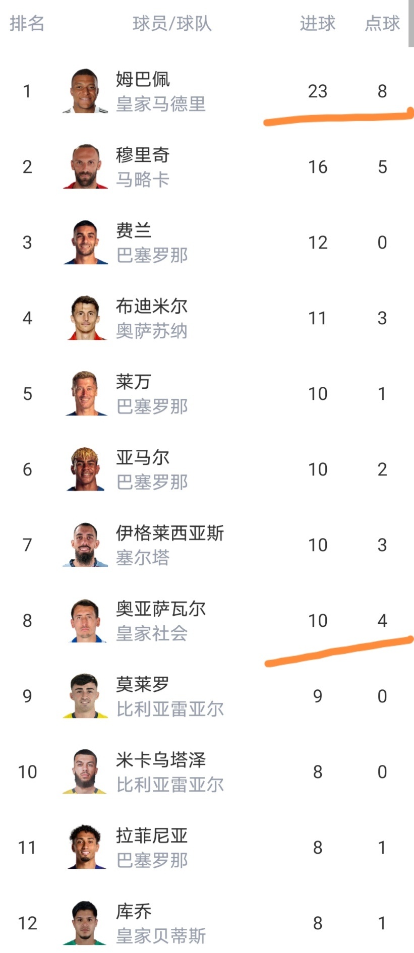 射手榜姆巴佩在打入8粒点球的情况下,取得了23球领跑,如果除去这8个点球,实际进球是15个,那么姆巴佩领先优势就没有那么大。