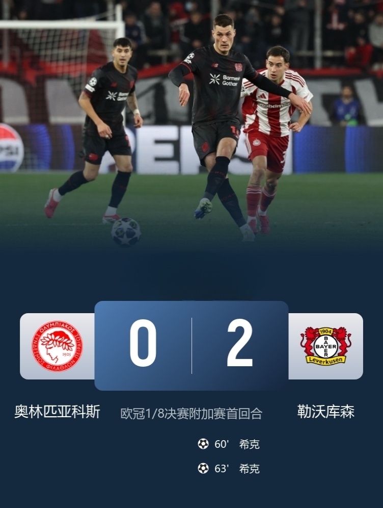 奥林匹亚科斯0-2勒沃库森!此役,希克双响,波库错失单刀!德甲球队还是很争气的,遇上实力不及自己的对手,还是稳妥拿下,抢得晋级先机。