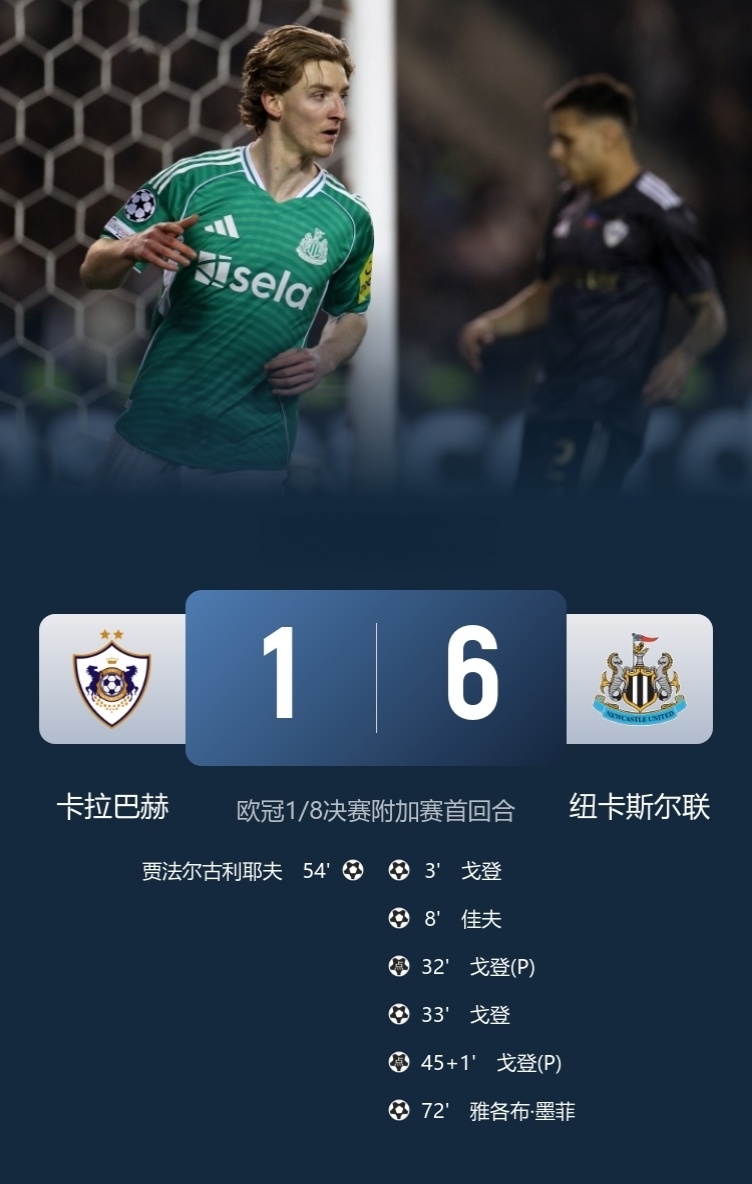 卡拉巴赫1-6纽卡斯尔!英超已经有5队获得直通欧冠淘汰赛的资格,分别是阿森纳、热刺、利物浦、曼城和切尔西,另一支参加欧冠的英超球队纽卡斯尔也获得了淘汰赛附加赛资格,喜鹊军团遇上了送分题,首回合客场6-1横扫卡拉巴赫,戈登半场大四喜,这意味着纽卡斯尔已经迈入欧冠淘汰赛的大门,英超6队参加欧冠淘汰赛的壮举就在本赛季首次开启!