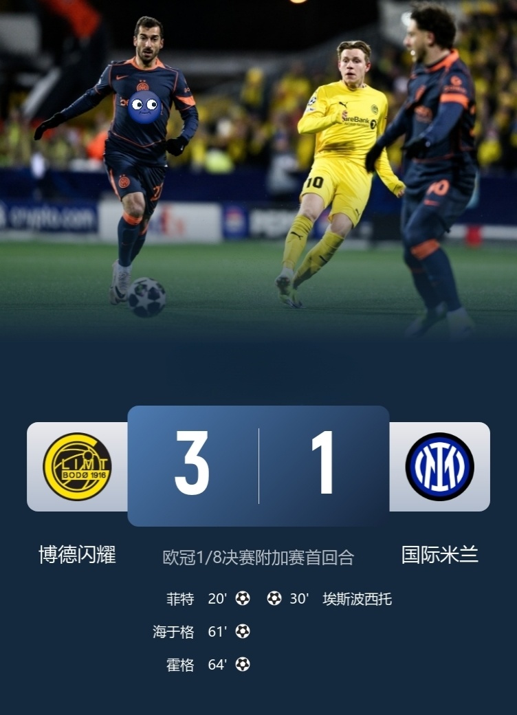 博德闪耀3-1国际米兰!意甲球队欧冠是真拉胯,领头羊国际米兰也不行,客场1-3不敌博德闪耀,爆出了欧冠淘汰赛附加赛首回合比赛的最大冷门!不得不说博德闪耀的主场是魔鬼主场,专克强队,曼城也是懂的。