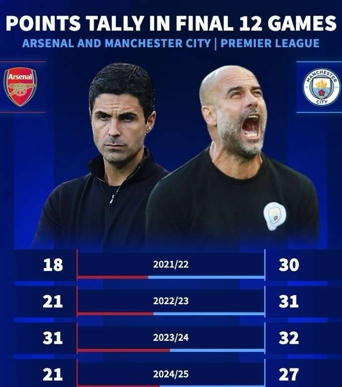 曼城在冬窗进补格伊和塞门约后,虽然同样是四线作战,但是势头明显强过阿森纳,特别是阿森纳在狼队身上掉链子后,曼城只要在直接交锋中战胜阿森纳,就能够抢过争冠主动权。曼城剩余12个对手中包括切尔西、阿森纳、纽卡斯尔和阿斯顿维拉4支强队,与阿森纳的对手高度相似,谁能够夺冠,就看谁能够在最后冲刺阶段咬紧牙关不掉链子了。