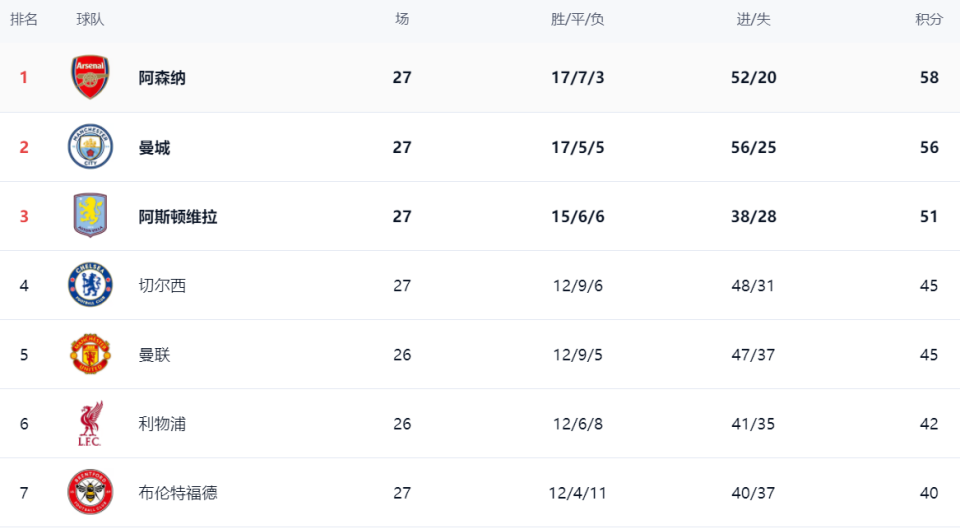 在积分榜上,阿森纳依然占据榜首位置,战绩是17胜7平5负,拿到58分。曼城赢球之后继续缩小与阿森纳的差距。曼城总积分达到56分,仅仅落后阿森纳2分。曼城最快下一轮能够登顶,当然,大前提是阿森纳丢分。没想到阿森纳之前累积的优势变得这么小。阿斯顿维拉51分排名第3。战平的切尔西总积分是45分,排名第4。少赛一场的曼联也是45分,排名第5。利物浦以42分排名第6。