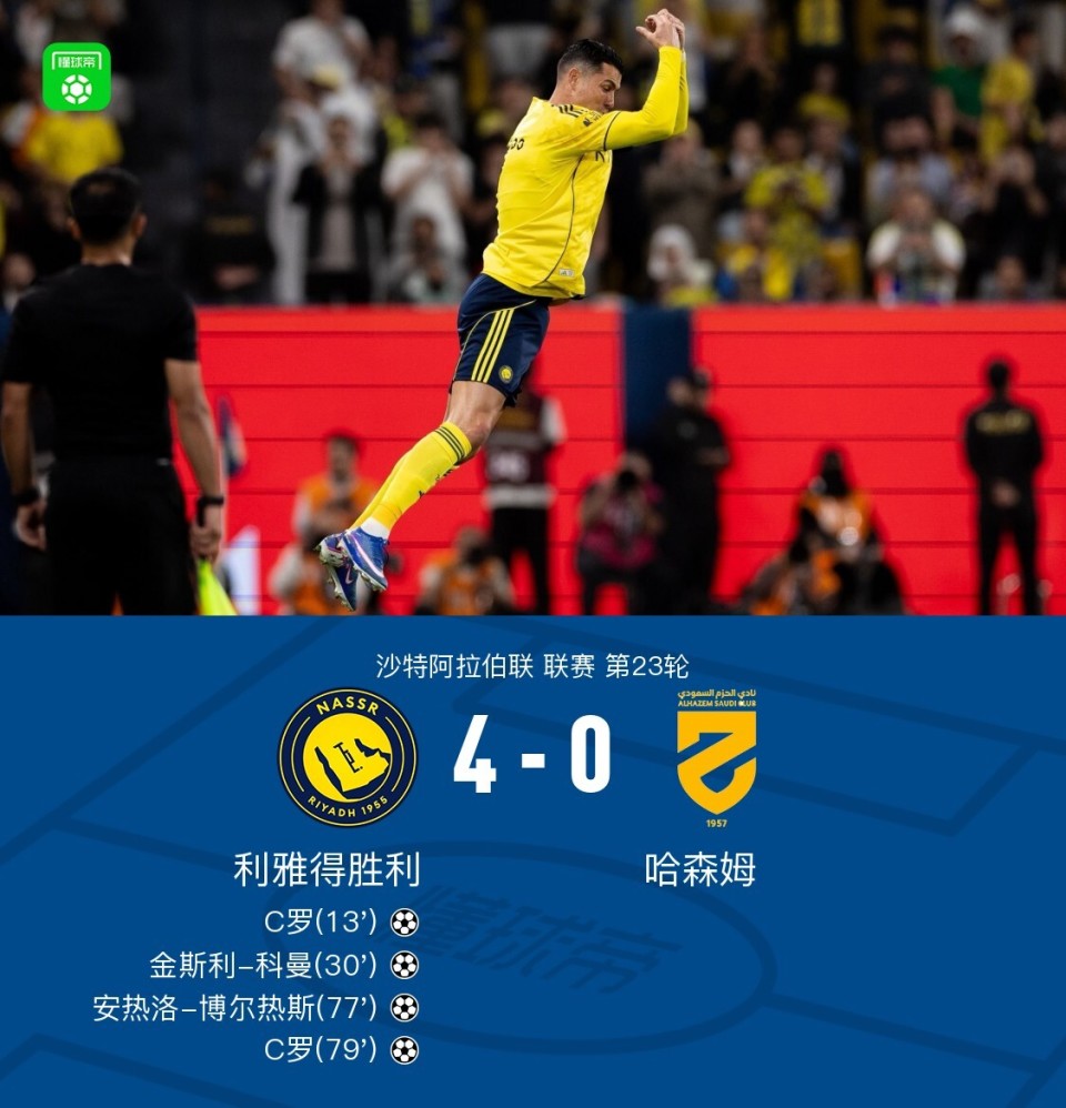 北京时间2月22日,沙特联第23轮,利雅得胜利主场对阵哈森姆。比赛中,C罗上演梅开二度,科曼建功,安热洛-博尔热斯一条龙破门。最终,利雅得胜利4-0大胜哈森姆。