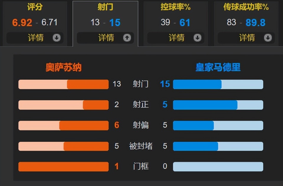 全场比赛,皇马的控球率为61%,一共有15次射门,其中5次射正;奥萨苏纳一共有13次射门,其中2次射正。