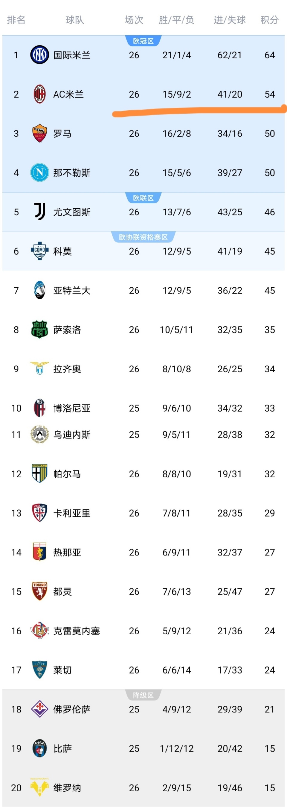 可以看到罗马队完胜克雷莫内塞之后,积分上涨到了50分,已经仅差第2的AC米兰队4分,可以说罗马逼近意甲前二了,同时落后榜首的国际米兰队14分,争冠还是希望不大,但是争亚军的希望还是很大的。而AC米兰队爆大冷门输球之后,已经停留在了54分,AC米兰第二的位置岌岌可危啊。而那不勒斯队输球之后,积分停留在了50分,排名跌至第4。而亚特兰大队击败那不勒斯队之后,积分上涨到了45分,已经追平了科莫队,仅差尤文1分,并且仅差第4的那不勒斯队5分,亚特兰大队继续向欧冠席位冲击。帕尔马赢球之后,积分上涨到了32分,远离了降级区,保级基本稳了。