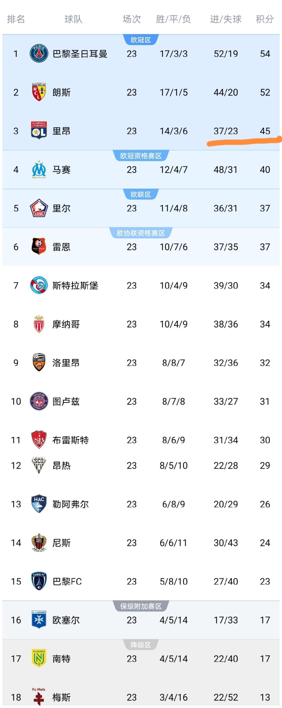 可以看到雷恩击败欧塞尔队之后,积分上涨到了37分,跟第5的里尔队积分相同,仅差第4的马赛队3分,同时仅差第3的里昂队8分,可以说雷恩有更进一步的空间,争欧冠席位不是没有可能。而里尔击败昂热之后,积分上涨到了37分,继续保持争欧冠的希望,而南特队赢球之后,积分上涨17分,保级希望还是有的。尼斯遭阻击之后,积分仅上涨到24分,排名第14,尼斯的排名不理想啊。里昂输球之后,积分停留在了45分,领先第4的马赛队5分,可以说里昂要小心了,不然欧冠席位可能不保了。