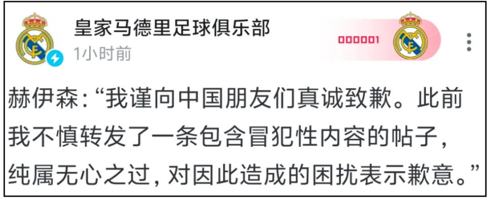 赫伊森出生于荷兰,2025年在西班牙国家队首秀,皇马是西班牙足球俱乐部,活跃于西甲联赛,赫伊森分享的辱华动态上写的是英语,咱们一没有要求他们中英西荷四语道歉,二没有要求皇马俱乐部全球平台发布道歉,只想要一个正式回应,结果得到的竟然是“特供道歉”。