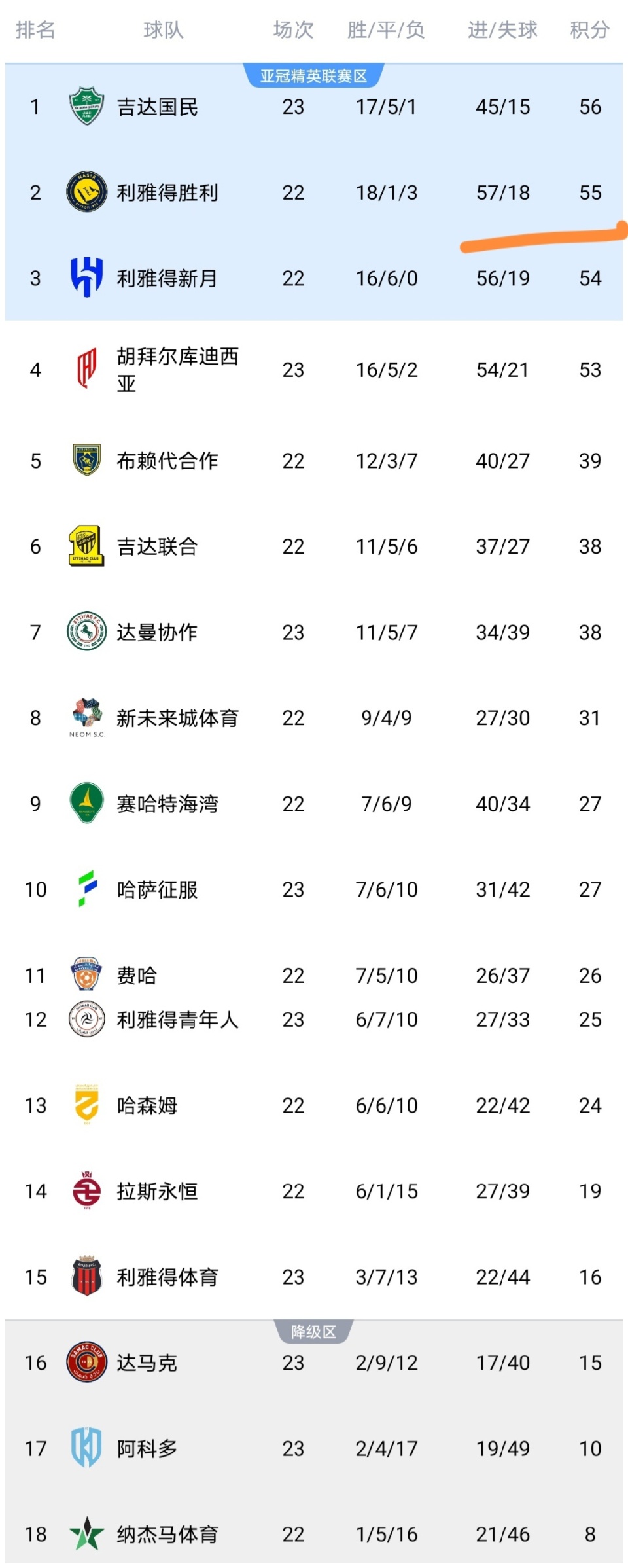 可以看到吉达国民击败达马克队之后,积分上涨到了56分,不仅反超了利雅得新月,也反超了C罗的主队利雅得胜利队,升至了沙特联的榜首。利雅得胜利队也暂时从榜首滑落,丢了榜首,当然,如果本轮利雅得胜利队能够取得胜利,依然能够重返榜首,就看C罗能不能率队顶住压力,拿到本轮的3分。而胡拜尔库迪西亚队大胜达曼协作之后,积分上涨到了53分,已经逼近前三了,并且仅差利雅得胜利队2分,可以说胡拜尔库迪西亚队也加入到了争冠行列,C罗怕不怕?