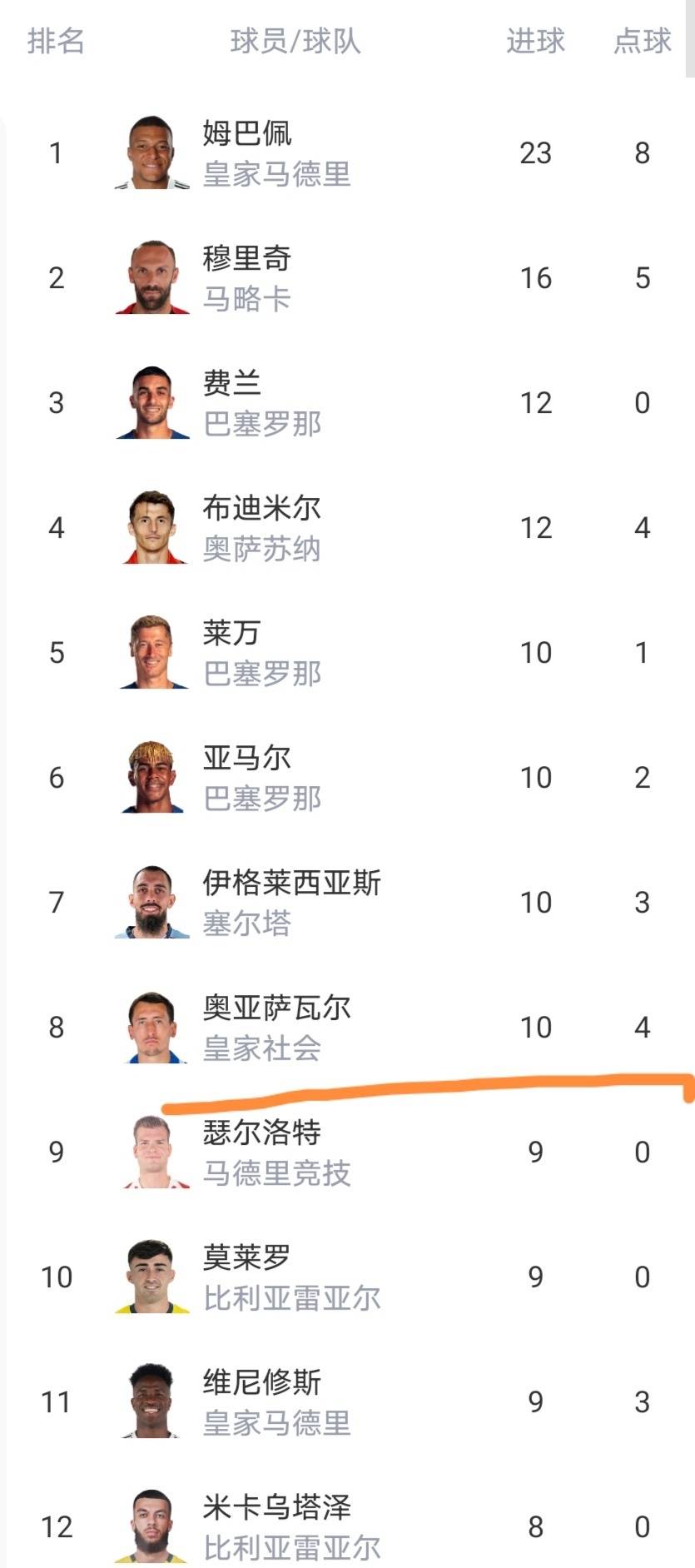射手榜依然是姆巴佩、费兰等8人进球上双。