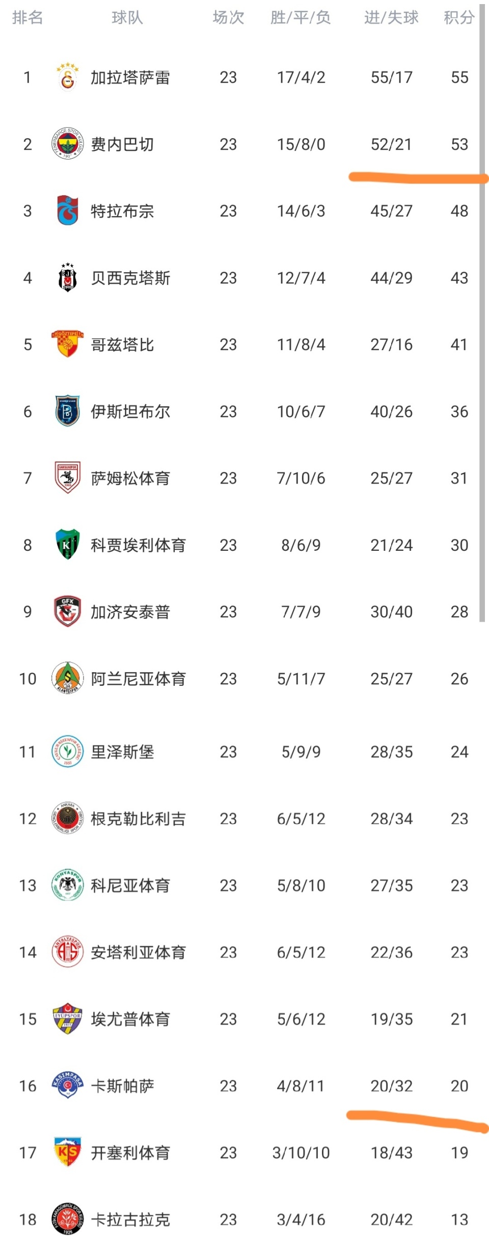 可以看到费内巴切队爆大冷门遭逼平之后,积分仅上涨到53分,继续排名第2,无缘追平榜首的加拉塔萨雷队,这显然是天助加拉塔萨雷队啊。费内巴切队也是不争气,给你机会都不中用啊,对方少一人都拿不下。虽然费内巴切队依然保持不败,但是费内巴切平局太多了,8场平局其实就已经丢了16分,哪怕少2场平局,费内巴切目前也是领跑的。