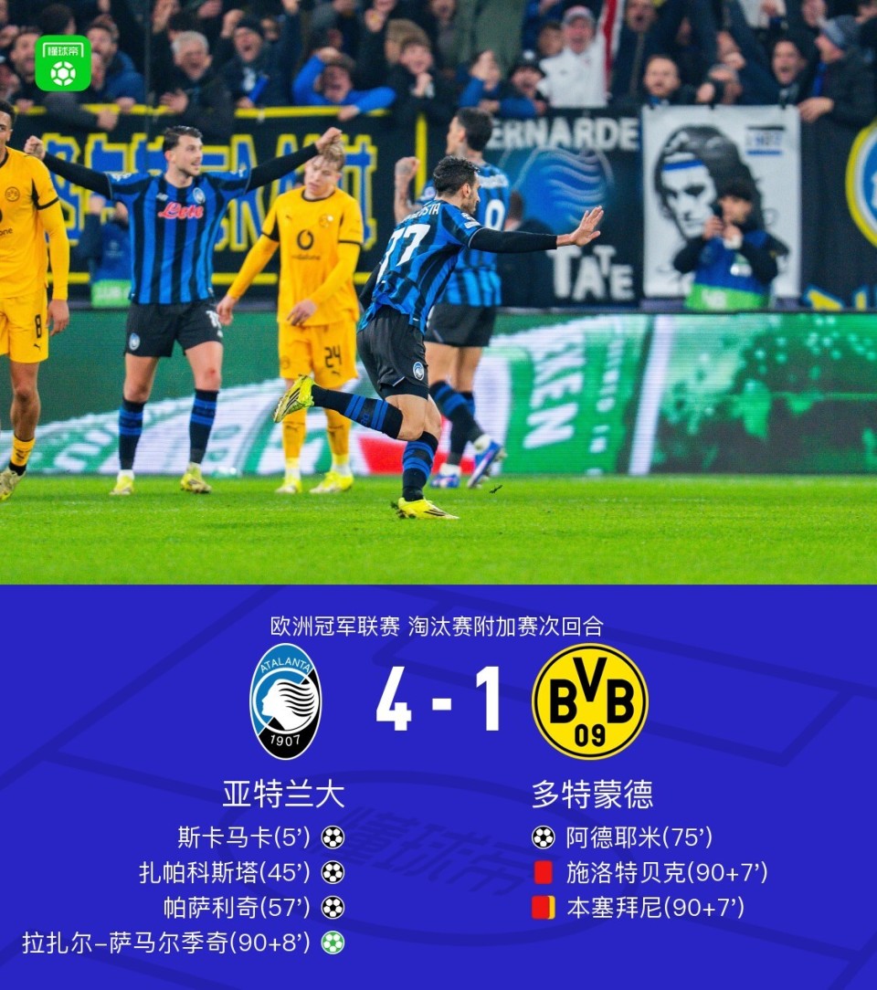 北京时间2月26日欧洲冠军联赛 淘汰赛附加赛次回合,亚特兰大对阵多特蒙德。亚特兰大斯卡马卡破门,扎帕科斯塔破门,帕萨利奇破门,拉扎尔-萨马尔季奇破门。多特蒙德阿德耶米破门。最终比分亚特兰大 4-1 多特蒙德。两回合总比分亚特兰大4-3多特蒙德。