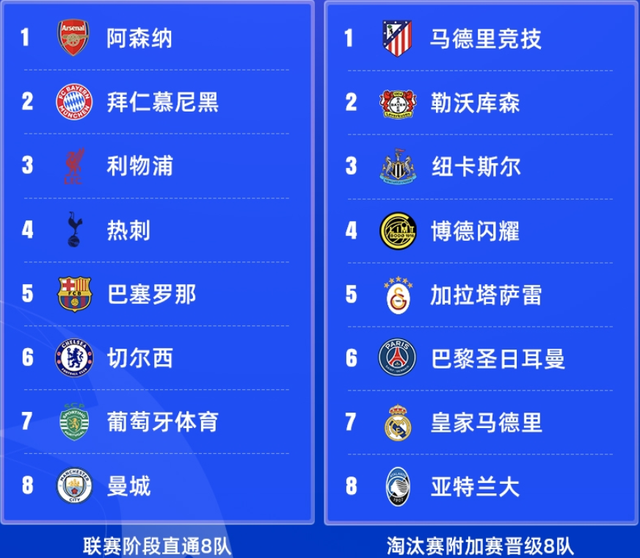 直通8队(联赛阶段前8):阿森纳(英超)、拜仁(德甲)、利物浦(英超)、热刺(英超)、巴萨(西甲)、切尔西(英超)、葡萄牙体育(葡超)、曼城(英超)