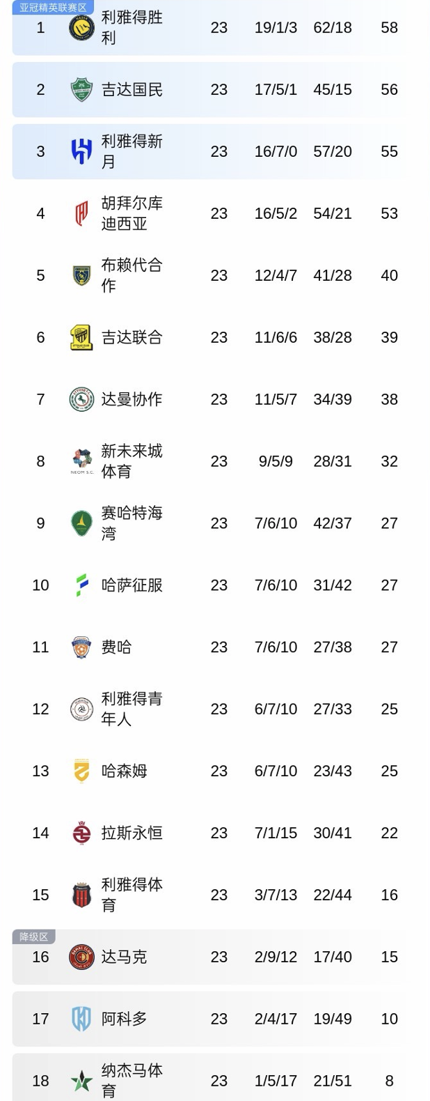 在目前的沙特联积分榜上,纳杰马23轮8分排名垫底,落后保级区8分,保级堪忧。在积分榜前列,胜利58分,吉达国民56分,新月55分,胡拜尔库迪西亚53分,排名第1-4位。布赖代合作40分第5,卫冕冠军吉达联合本赛季表现低迷,只有39分排名第6,还失去了队长本泽马。