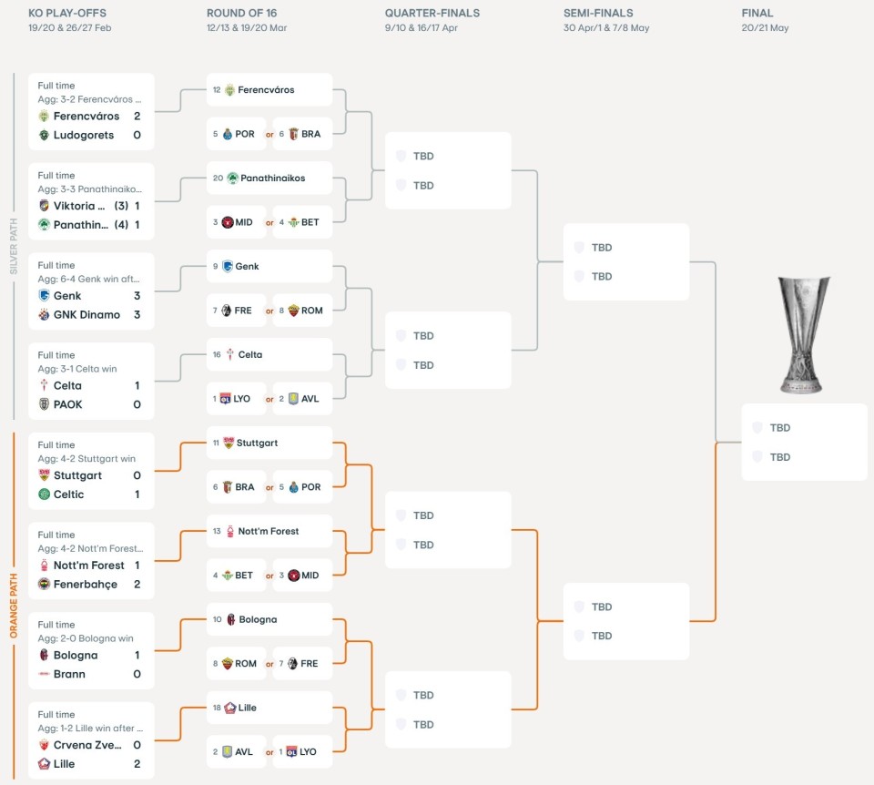 北京时间2月27日,本赛季欧联淘汰赛附加赛的比赛已全部结束。在两回合较量后,费伦茨瓦罗斯、帕纳辛奈科斯、斯图加特、里尔、亨克、塞尔塔、诺丁汉森林、博洛尼亚八家俱乐部最终闯进淘汰赛。