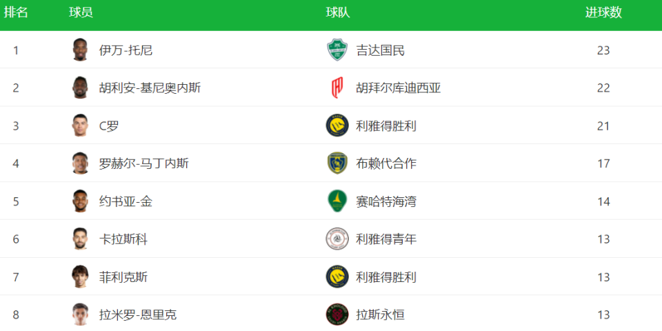 吉达国民头号射手伊万-托尼在本场比赛没有进球。不过,他依然占据射手榜第1的位置。伊万-托尼总共打进了23球,其中有8粒点球进球。胡拜尔库迪西亚的胡利安-基尼奥内斯打进22球,排名第2。C罗总共打进21球,其中包括5粒点球,排名射手榜第3。C罗本赛季想要拿到金靴难度不小。
