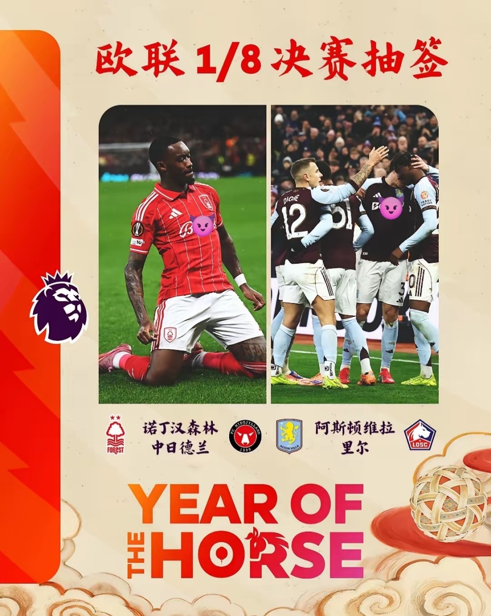 再看欧联,英超2队出战1/8决赛,诺丁汉森林vs中日德兰(丹超),阿斯顿维拉vs里尔,以目前英超球队的实力,森林和维拉晋级8强问题不大。