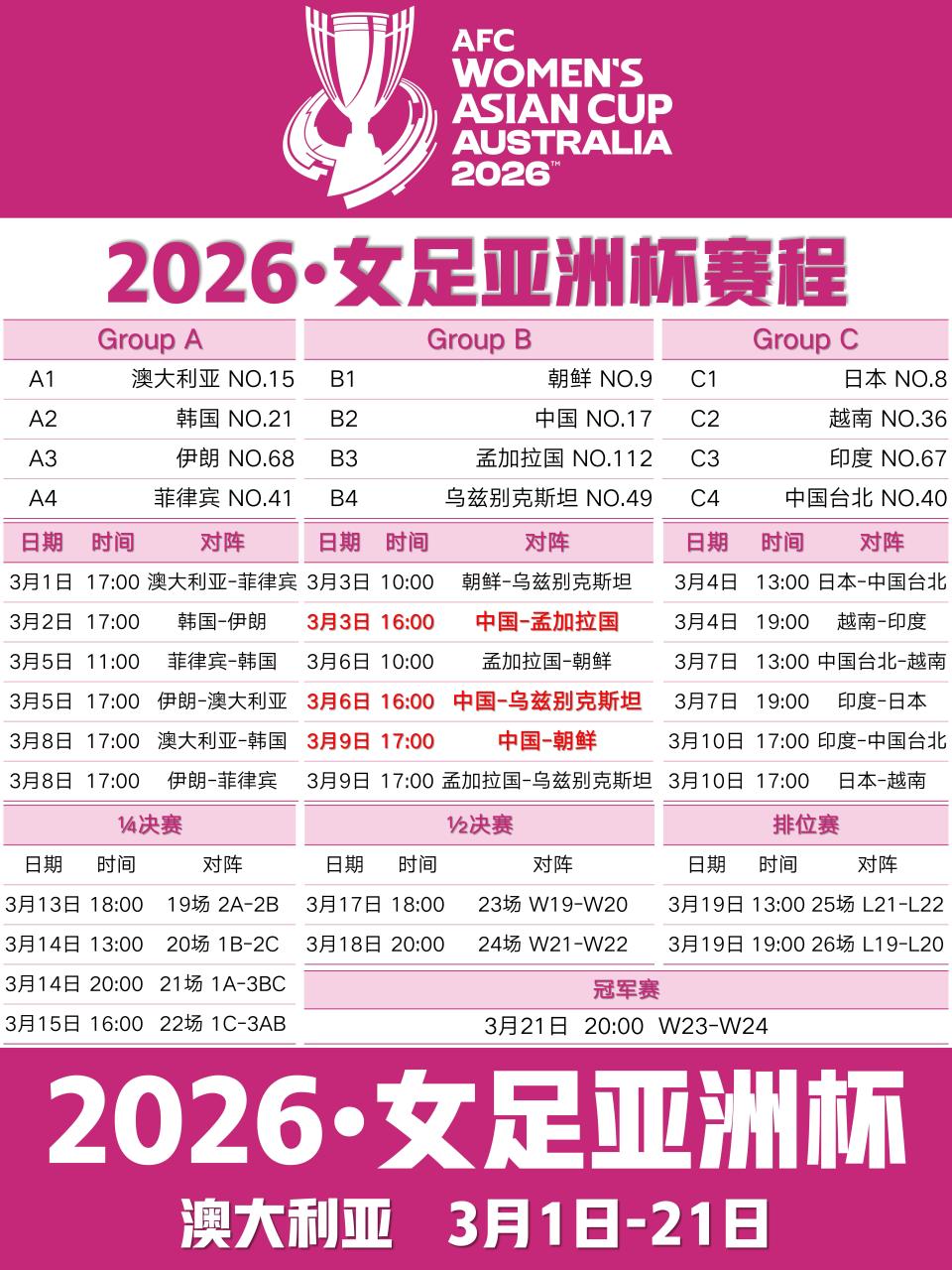 根据抽签分组,中国女足与朝鲜、孟加拉国、乌兹别克斯坦同处B组。小组赛赛程如下: