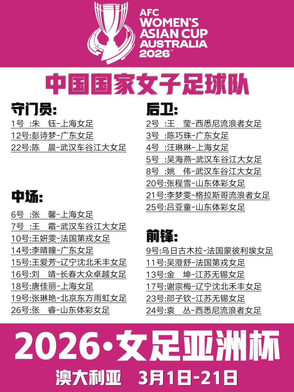 中场:6号张馨、7号王霜、10号王妍雯、14号李晴瞳、15号王爱芳、16号刘靖、18号唐佳丽、19号张琳艳、26号张睿