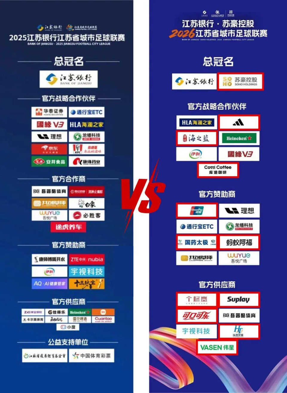 根据先前发布的信息,2026赛季“苏超”江苏银行、苏豪控股双冠名,还有阿迪达斯、可口可乐等国际品牌,以及国缘V3、海澜之家、洋河海之蓝等等大牌。