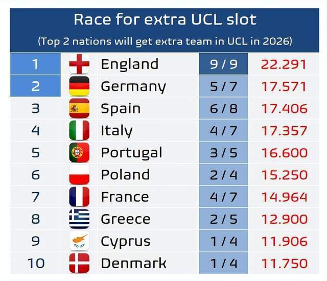 本周欧战三级比赛的16强全部产生,英超9队全部晋级,德甲西甲各2队出局,意甲3队遭淘汰。目前欧战积分中,英格兰以22.291分遥遥领先,基本确定拿到新赛季5个欧冠参赛名额。德国17.571分排名第二,西班牙17.406分第三,意大利17.357分第四,葡萄牙16.6分第五。前二联赛将获得下赛季一个额外欧冠名额,竞争异常激烈。