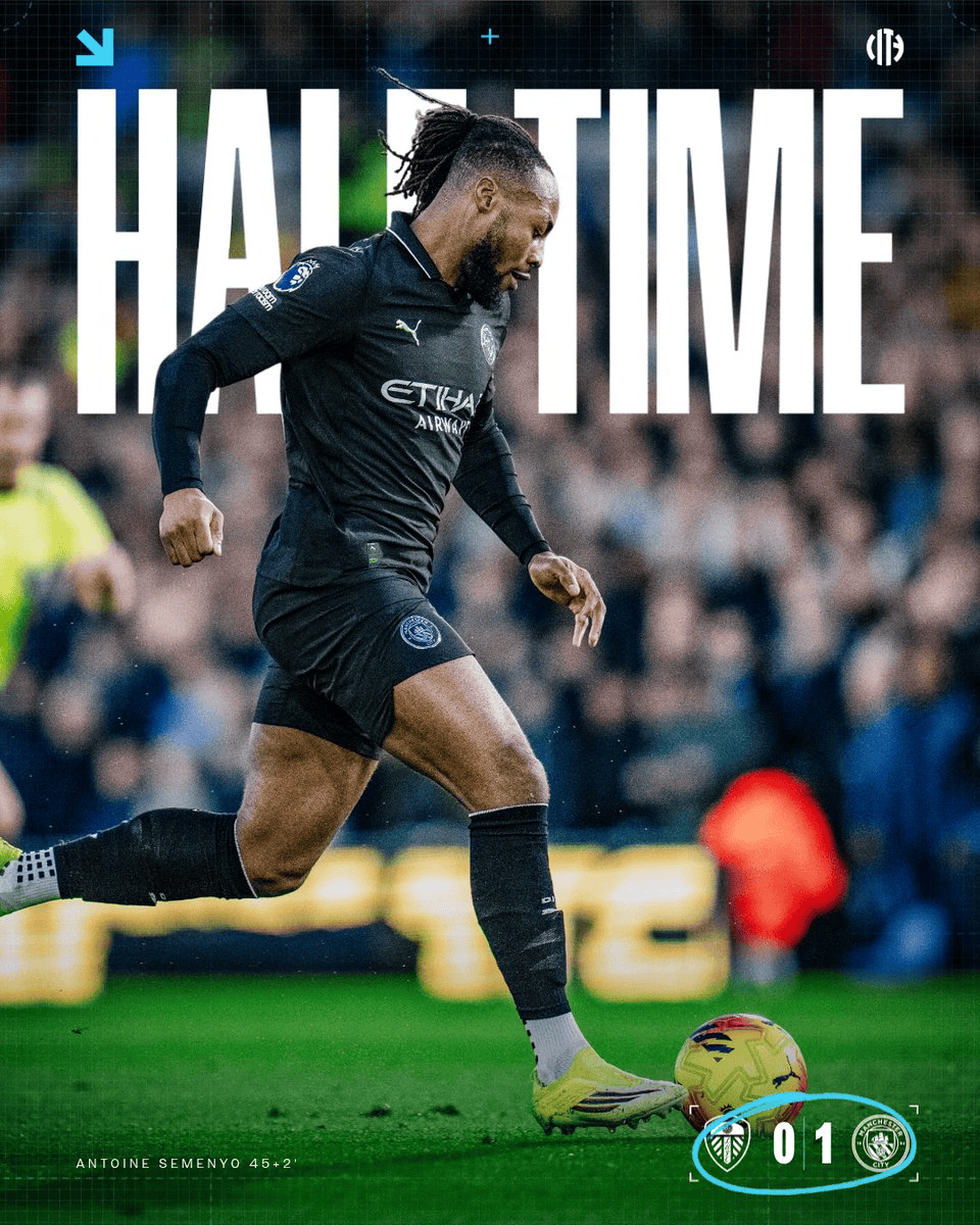 虎扑03月01日讯 英超第28轮,曼城客战利兹联,半场战罢,曼城1-0领先。