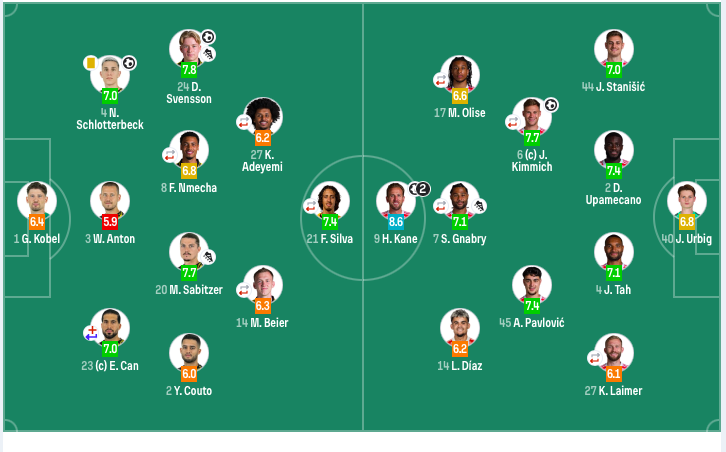 拜仁慕尼黑首发:40-乌尔比希、2-于帕梅卡诺、4-塔、44-斯坦尼西奇、45-帕夫洛维奇、6-基米希(90’8-格雷茨卡)、7-格纳布里(62’10-穆西亚拉)、27-莱默尔(90’20-比朔夫)、14-迪亚斯、17-奥利塞(90’3-金玟哉)、9-凯恩。