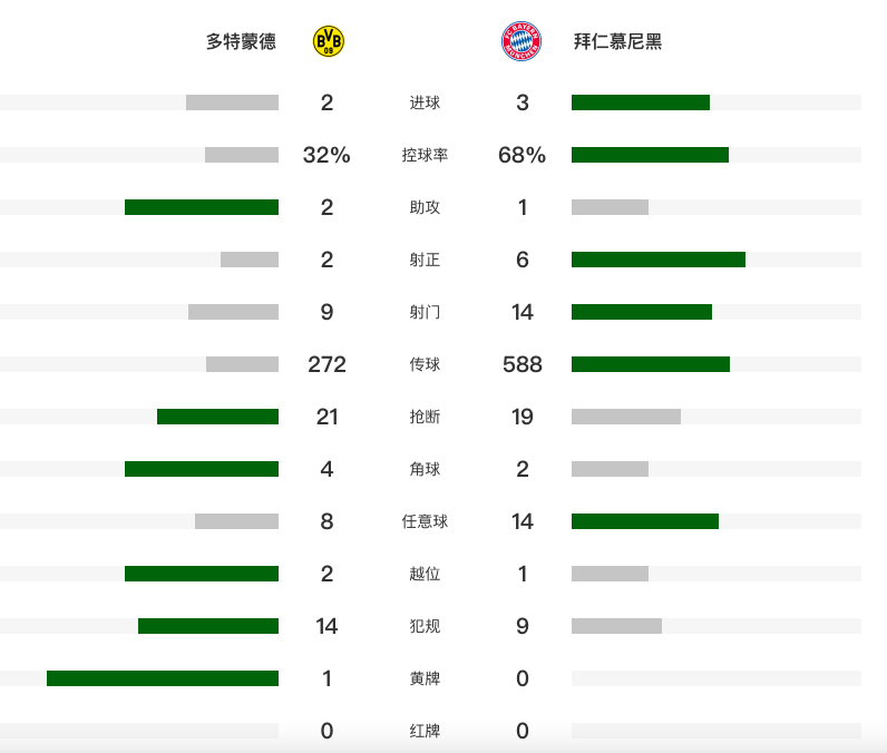 北京时间3月1日凌晨,德甲第24轮迎来国家德比,多特蒙德坐镇主场迎战拜仁。第26分钟,施特罗贝克头槌破门,这是多特蒙德的第一次射门。第54分钟,格纳布里助攻凯恩破门。第70分钟,施特罗贝克送点,凯恩点射梅开二度。第83分钟斯文松扳平比分,4分钟后基米希绝杀。最终,拜仁客场3-2战胜多特蒙德,终结大黄蜂的16轮不败,在还剩10轮的情况下,领先多特蒙德11分。