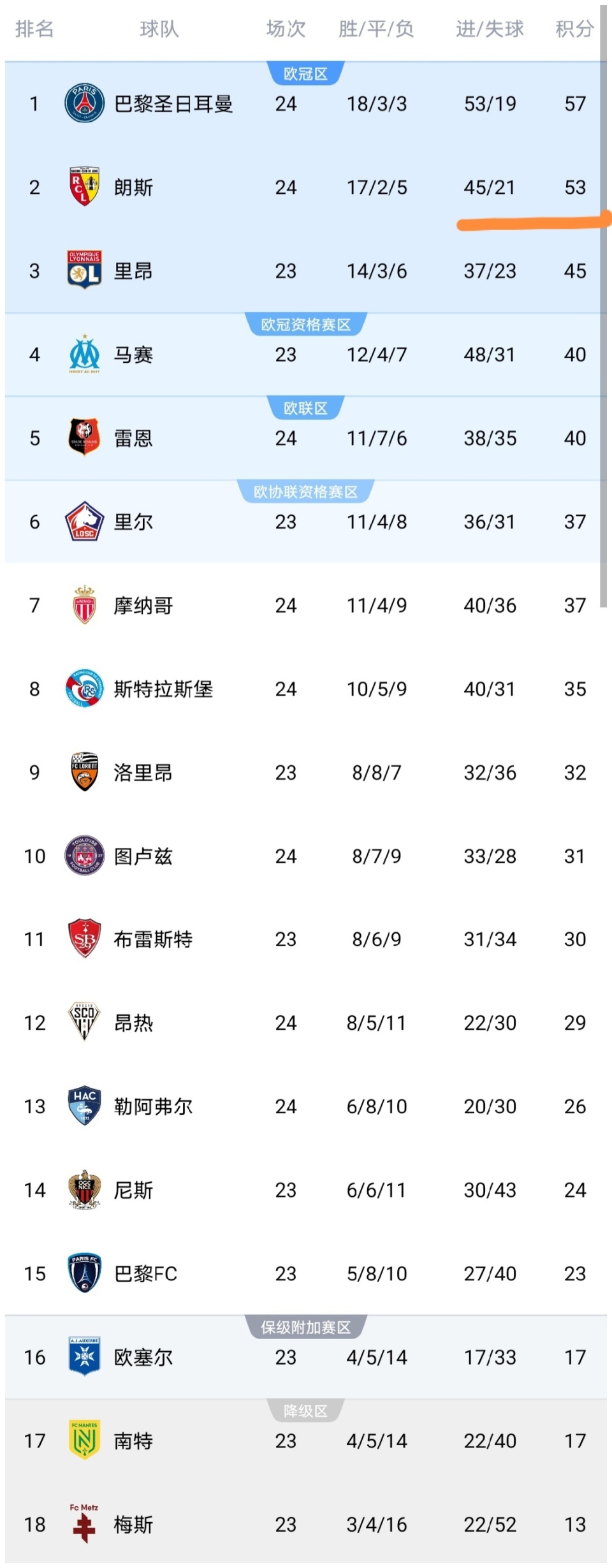 可以看到巴黎圣日耳曼队在击败勒阿弗尔队之后,积分上涨到了57分,已经领先第2的朗斯队4分之多了。可以说如果巴黎圣日耳曼队自己不犯错的话,朗斯就没有夺冠的希望了,所以巴黎圣日耳曼队要打起十二分精神啊,别再犯错了,早点把冠军揽入怀中。而摩纳哥击败昂热之后,积分上涨到了37分,已经追平了第6的里尔队,并且仅差第5的雷恩3分,差第4的马赛队也是3分,可以说摩纳哥队逼近前四了,摩纳哥队依然有希望争夺到欧冠席位,可以看到法甲欧冠席位的争夺白热化了。