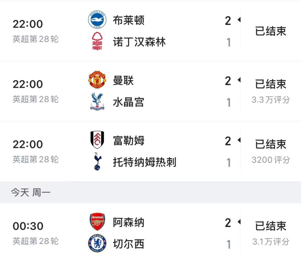 虎扑03月02日讯 英超第28轮最后一个比赛日,四场比赛全都以相同比分结束,主队都以2‑1的比分拿下胜利: