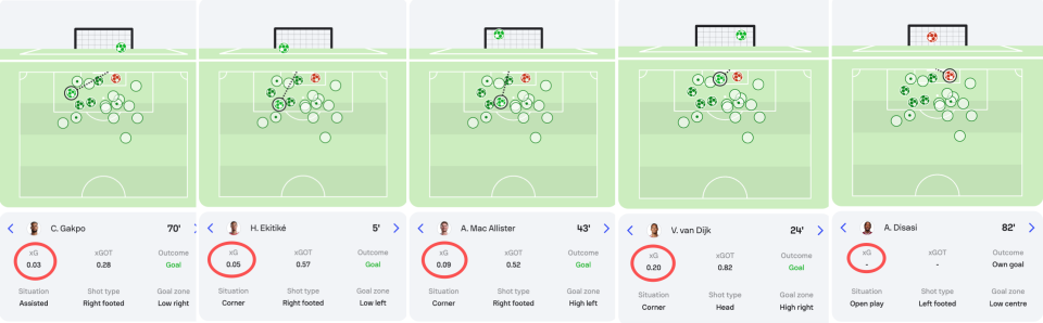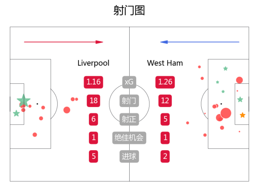 过去三场的胜利里,最近的一场是主场5:2大胜西汉姆,这场比赛如果光看比分的话利物浦应该是攻势如潮的,可实际上受限于双边的实力和维尔茨的缺阵,对阵西汉姆的这场比赛,利物浦总创造出来的进球机会其实并不多,也就看看和西汉姆打个平手:
