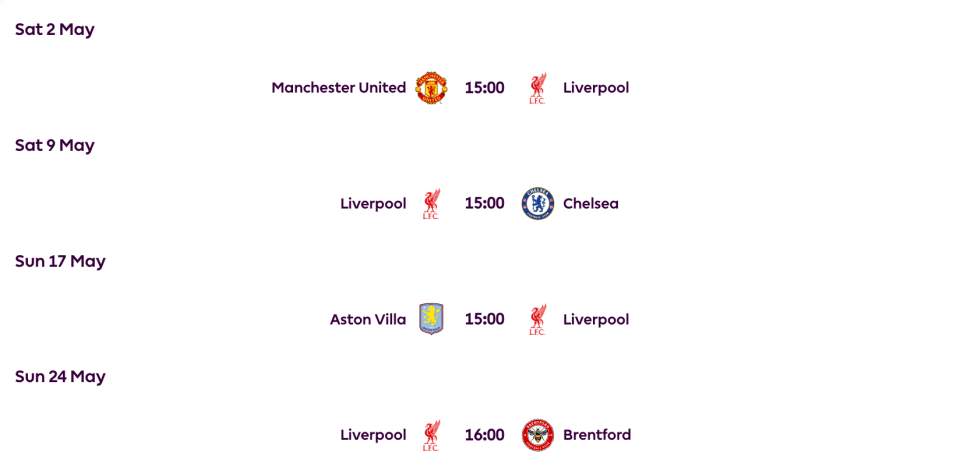 今年的5月份,也就是本赛季的最后一个月,利物浦争四的命运就被掌握在这个月: