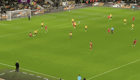 第78分钟,狼队打出快速反击,阿洛克达尔在和范戴克的对抗中有一个轻微的推人动作,罗德里戈·戈麦斯破门得分。