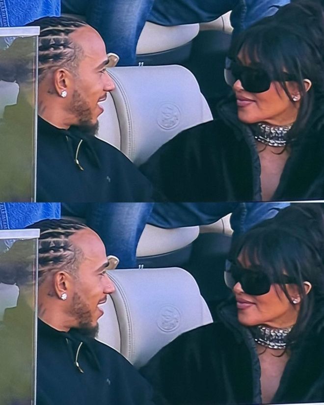 有意思的是,坐在两人身后的金-卡戴珊同母异父的妹妹肯达尔-詹娜,詹娜也曾与汉密尔顿交往过。