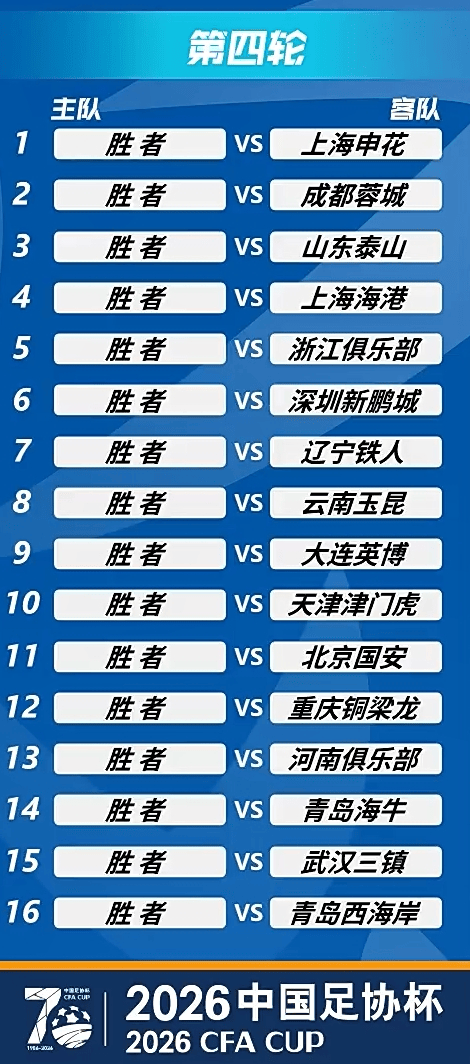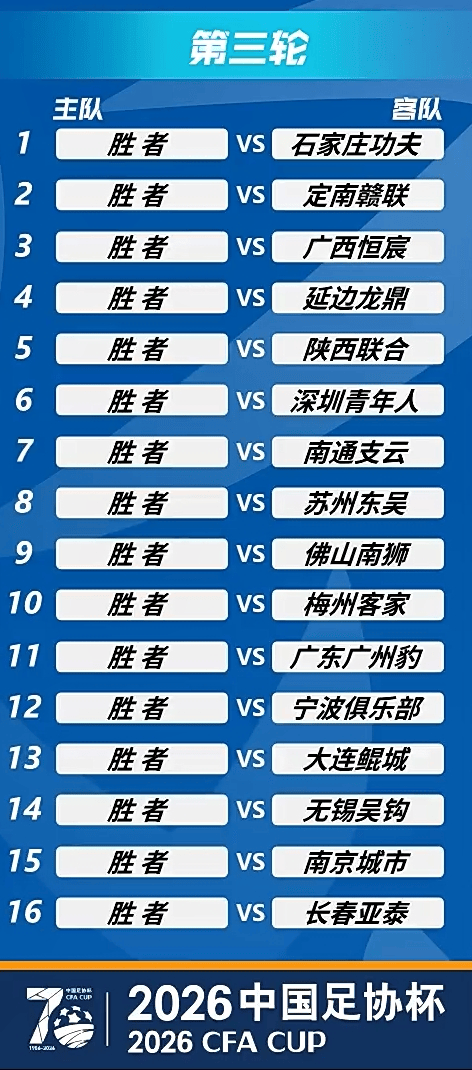虎扑03月04日讯 2026年足协杯1-4轮抽签结果出炉,恰逢足协杯70周年,今年一共80支球队参赛。中甲球队第三轮登场,中超球队第四轮登场。