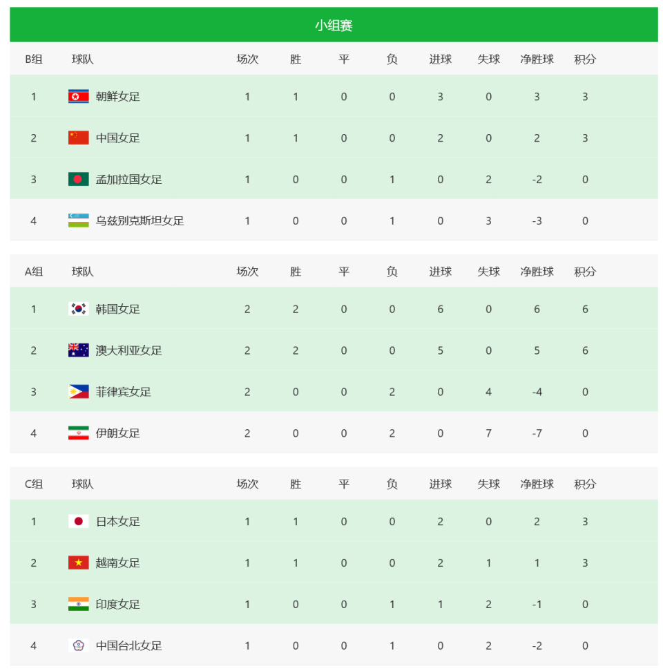 至此,A组前2轮战罢,韩国女足与澳大利亚皆取得2连胜,同积6分排名小组前二。目前韩国女足、澳大利亚皆锁定小组前二,提前拿到八强资格,末轮双方直接交锋争夺小组头名。