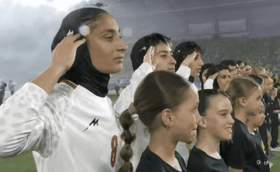 休战3天后,伊朗女足今日迎战东道主澳大利亚队。赛前的奏唱国歌仪式,伊朗女足这次没有沉默,而是集体高唱国歌,且向前方行军礼。随后的比赛中,伊朗队再次被打爆。上半场,伊朗队就丢了3个球。下半场,澳大利亚再进1球,将比分锁定为4-0。